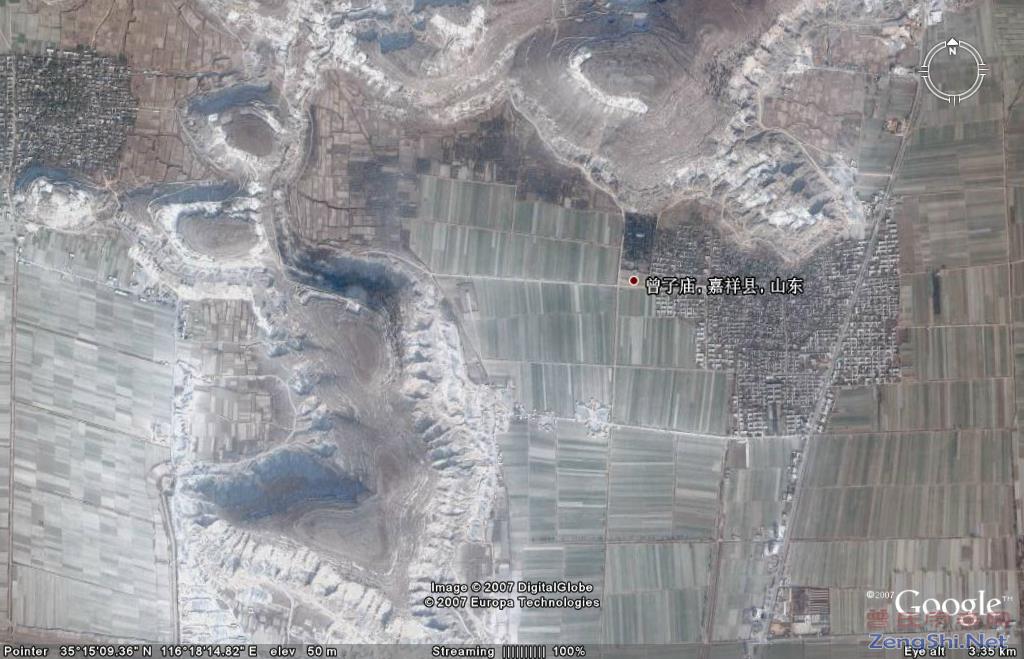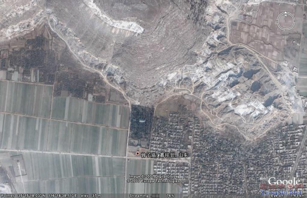 下图:3千米高空俯视下的曾子庙,可以看见它右前方的山和后山都被开采的白花花了。图左边的曾林就在山边。