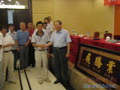 牌匾赠送仪式上会长和曾庆洪宗亲握手。