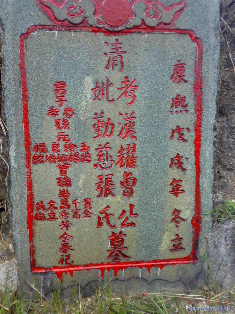 墓碑的文字: 康 熙 戊 戍 年 冬 立 考汉耀曾公 清 墓 妣勤慈张妈 忠 玉禄卿 贵文富位 男子 孙元 珍辉斌 曾孙几 千武秀 等仝奉祀 孝 良福锦 万全立 葬在今广东省陆丰市碣石镇西坡林村后山