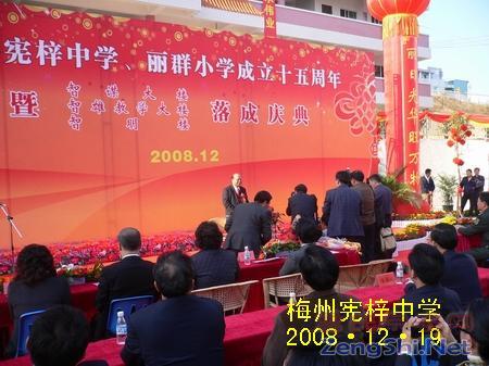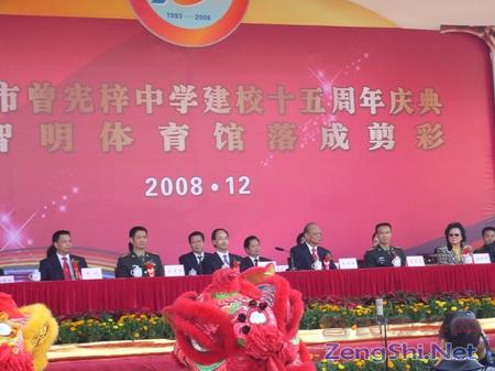 20日·8:20全体与会宗亲参加“曾宪梓中学建校十五周年庆典”。庆典在热烈感人的气氛中度过,参加庆典的有曾宪梓伉俪、曾智谋伉俪、曾智雄伉俪、梅州市政府各主要领导和慎终航天员费俊龙、聂海胜。 庆典期间最为感人的是整个过程中,全体宪梓中学数千师生对宪梓博士的崇敬表情,以及宪梓博士一番语重心长的讲话,从他小时候一个贫穷农家孩子成长的过程,谈到到创业兴家,他数十年报效祖国,对教育、体育、航天、医疗等事业捐献的家、国情怀,激励学子们认真学习、将来报效国家、回报社会,为强国、富国做出贡献。期间航天员费俊龙讲话,用他们航天员“挑战极限”的精神启发学生,寄望大家奋发学习、为国增光。