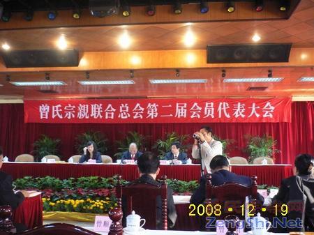 2008年12月18至21日,曾氏宗亲联合总会在风景美丽的山城——广东·梅州召开总会代表大会。这里是著名慈善家、企业家、原全国人大常委、金利来集团董事长曾宪梓博士的家乡。山清水秀的梅州,风景如画,让参加本次曾氏宗亲联合总会的代表一百二十多名各地曾氏宗亲领略到家族的团结,感受到宪梓博士给家族带来的荣耀。会议期间,审议曾氏宗亲联合总会过去两年的工作情况,通过了修订《曾氏宗亲联合总会章程》,通过了《曾氏宗亲联合总会选举办法》,选举产生了曾氏宗亲联合总会第二届会长宪梓、理事长文仲、监事长广春、秘书长令霞、还有副会长多名、副理事长多名、副秘书长多名等职务。