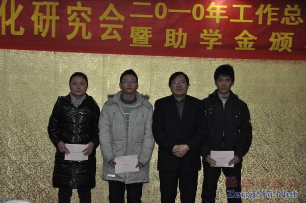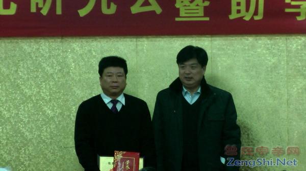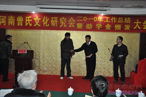 上图:河南社科院历史与考古研究所所长、河南省姓氏研究会常务副会长、曾研会总顾问张新斌为贫困学子颁发助学金