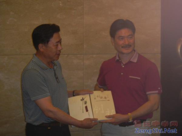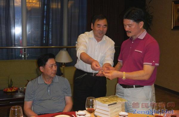 19点30分,曾继雄等四位贵宾相继走进接待厅,受到9位河南曾氏宗亲的热烈欢迎。宾主相互介绍时,当河南宗亲得知四位贵宾就有两位是曾姓宗亲,一位是当地曾氏宗亲会聘请的秘书长,并是郑州老乡时,热烈的掌声一再响起。接着,庆祝将军和占国会长代表河南宗亲向来宾赠了书刊和会徽。宾主合影留念。庆祝将军在随后的家族晚宴上致酒辞,预祝贵宾们访豫圆满成功!祝贺曾氏宗亲兴旺发达、誉满四海、敦本报国!