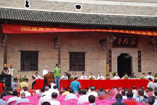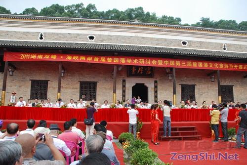 | 九月三日上午,2011湖南双峰·海峡两岸首届曾国藩学术研讨会暨中国第三届曾国藩文化旅游节在湖南省娄底双峰县曾国藩故居隆重开幕!来自海峡两岸三地的专家学者、文正公(以及其弟弟)的后裔和曾氏宗亲代表、文艺界代表、企业界代表逾800人受邀参加。这次活动筹备了一年多,值曾文正公诞辰200周年,主办单位邀请海峡两岸三地专家学者和社会名流聚汇一堂,围绕“曾国藩与中国对外开放”为主题,总结交流两岸近年来曾国藩研究成果。截止活动开模式前,共收到来自海峡两岸的交流论文100余篇、对联3000多副,主办单位将通过评选,对交流优秀论文编辑出版。