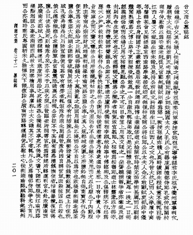 兄弼、提舉京西南路學事按部,溺死無後,特恩補公将仕郎,公以太夫人命不敢辭,試吏部銓中優等,賜上舎出身,擢國子正兼欽慈皇后宅教授,遷辟雍博士兼編修道史檢閲官,時禁元祐學術甚厲,而以剽剝穨闒熟爛為文博,士弟子更相授受,無敢異一,少自激昻輙擯弗取曰:是元祐體也。公獨憤歎思一洗之,一日得經義絶倫者,而他塲已用元祐體見黜,公爭之不可,眀日㑹堂上出其文誦之,一坐聳聽稱善,爭者亦奪氣,及啓封則内舎生陳元有也,元有遂釋褐文體,為少變學者相賀。改宣義郎,入祕書為挍書郎。道士林靈素,以方得幸尊寵用事,作符書號《神霄籙》,自公卿以下羣造其廬拜受,獨故相李綱、故給事中傅崧卿及公俱移疾不行。出為應天少尹,尹故相徐處仁敬待公,公甞决疑獄,徐公謝曰:始徒謂君儒者,乃精吏道如是邪,一日有中貴人傳中㫖取庫金,而不齎文書,徐公用府寮議将姑許之,公力爭至謁告不出,徐公雖不果用,而尤以此服。公丁内艱(守母丧)服除,主管南外宗室財用。靖康初提舉淮南東路茶鹽,公事女真入侵,都城受圍,太府鹽鈔無自得,商賈不行,公乃便宜為太府鈔給之,比賊退得緡錢六十萬,侵亂之餘國用賴,是以濟而公不自以為功也。改提舉荆湖北路茶鹽,公事羣盗大起,湖北諸郡皆破,獨辰沅靖三州僅存,有封樁鹽,公以與蠻獠貨易,得錢數鉅萬,間道上行,在所賊孔彦舟據鼎州,川陕宣撫使司幕官有傅雱者,輙假彦舟湖北副總管,彦舟因自稱官軍,而殺掠四出自若也。俄以總管檄,檄公求鹽給軍食,官屬震恐請與以紓禍,公卒拒不予,其後有為鼎澧鎮撫使者,怙權暴横復欲得鹽,公曰:使吾畏死則輸彦舟矣,亦卒不予。以疾乞閒,主管臨安府洞霄宫,起為福建路轉運判官,未赴。改廣南西路廣南支郡賦,入悉轉運司,嵗度所用給之,吏緣為奸,公獨親其事,吏不得與,文書下諸郡惬服,徙江南西路提点刑獄公事,改兩浙西路。故太師秦檜用事與敵和,士大夫議其不可者輙斥。公兄為禮部侍郎,爭尤力首斥,而公亦罷。時秦氏專國柄未久猶,憚天下議復,除公廣南西路轉運副使,以慰士心,徙荆湖南路,賊駱科起,郴州宜章縣郴道桂陽皆警,且度嶺詔湖北宣撫司遣将逐捕,賊引歸宜章之臨武峒,宣撫司遂以平賊聞,公獨奏其實,朝廷始命他将討平之,主管台州崇道觀,起提舉湖北茶鹽未赴,改廣西轉運判官。公雖益左遷,然扵進退從容自若,人莫能窺其涯,復主管崇道觀,寓上饒七年,讀書賦詩盖将終焉。紹興二十五年檜卒,太上皇帝當宁慨,然盡斥其子孫婣亲,而收用耆舊與,一時名士。十一月起公提点兩浙東路刑獄,公老矣而精明不少衰,去大猾吏張鎬,一路稱快。眀年知台州,公娶錢氏,有郡酒官者,夫人族子也。大為奸利,且恣横患苦里閭,公亟捕繫獄,奏廢為民。黄巖令用兩吏為囊橐,以受賕吏持之,令不勝怒械吏置獄一夕皆死,公發其罪,或以書抵,公曰:令左丞相客也。公治益急亦坐廢,踰年召赴行在,所力以疾辭,除直祕閣歸故,官數月復召既對,太上皇帝勞問甚渥,曰:聞卿名久矣。公因論士氣不振既久,陛下興起之,扵一朝矯枉者必過直,雖有折檻斷鞅,牽裾還笏若賣直沽名者,願皆優容奨激之。時太上懲秦氏,專政之後開言路、奨孤直,應詔論事者衆。公懼或有以激訐獲戾者,故先事反覆,極論以開廣,上意太上大悦,除祕書少監,先是少監選輕士,至不樂入館,公既以老臣自外超用,名震亰都,及入朝鬢須皓然,衣冠甚偉,雖都人老吏皆感欷,以為太平之象。扵是公去館中三十有八年矣。舉故事與同舎賦詩飲酒,縱談前輩言行,臺閣典章,從容每竟日,故相湯思退甞語客曰:恨進用偶在前不得,當斯時從曾公逰也。其為薦紳歆慕如此,擢尚書禮部侍郎,初公兄楙歴禮部侍郎至尚書,兄開亦為禮部侍郎,至是公復繼之,衣冠尤以為盛事。二十七年吴越大水,公極論消復災變之道,及言賑濟之令,當以時下太上皆嘉納。時将郊祀,公力請對言臣老筋力弗支矣,陛下郊天,若禮官失儀亦足辱國,太上曰:卿氣貎不類,老人姑為朕留,公再拜謝曰:臣無補萬分一,惟進退有禮尚不負陛下拔擢,不然且為清議罪人,乃以集英殿修撰提舉洪州玉隆觀,又三嵗除,敷文閣待制。金主亮盜塞,下詔進討,已而敵大入或欲通使,以緩其来,公方病卧,聞之奮起上疏曰:遣使請和増幣獻城終無小益,而有大害,為朝廷計,當甞膽枕戈專務,節儉整軍,經武之外一切置之如是,雖北取中原可也。且前日陛下降詔諸将,傳檄數金人,君臣直詬罵耳,何詞復和邪?今上初受内禪,公又上疏,累數千言,大槩如前疏,而加詳,既封奏具衣冠,遡闕再拜乃發。公自宣義郎十一遷為左中大夫,至是以即位恩遷左太中大夫,執政欲起,公入侍經筵,度不可致,乃以公子逮為提点浙西刑獄,以便養。隆興二年公上章謝事,遷左通議大夫致仕。荘文太子立,群臣為父後者,得加封其親,公子逢請扵朝,而有司疑公官高,詔特遷左通奉大夫,乾道二年(1166年)五月戊辰卒扵平江府逮之官舎,享年八十三。爵至河南縣開國伯,食邑至七伯户。公平生燕居荘敬如齋,至沒不少變。九月辛酉,逢等葬公扵紹興府山隂縣鳯凰山之原,詔贈左光禄大夫,有司謚曰:文清。娶故翰林學士錢勰之孫、朝請郎東羙之女,封魯國太夫人,男三人:逢、朝散大夫尚書左司郎中;逮、朝奉大夫充集英殿修撰知湖州;迅、通直郎主管台州崇道觀。女一人,嫁右朝散郎知吉州吕大器。孫男七人:槃、廸功郎監户部贍軍烏盆酒庫;桌、承務郎新知平江府長洲縣;梁、從政郎監户部贍軍諸暨酒庫;