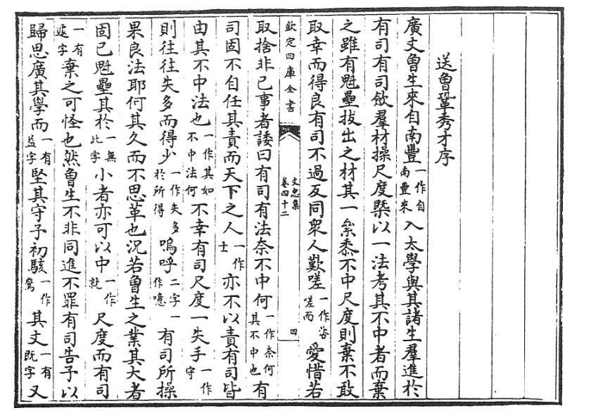 提要:本文为北宋欧阳修赠序曾巩。曾巩二十岁已因文才名闻,颇受欧阳修赏识。庆历二年(1042年),曾巩参加礼部会试落第。欧阳修为曾巩抱不平,并质疑当时的选取标准。在曾巩离京辞行时,撰本文赠曾巩,目的既批评了当时的考试制度,也激励年轻的曾巩不要放弃,继续努力学习。