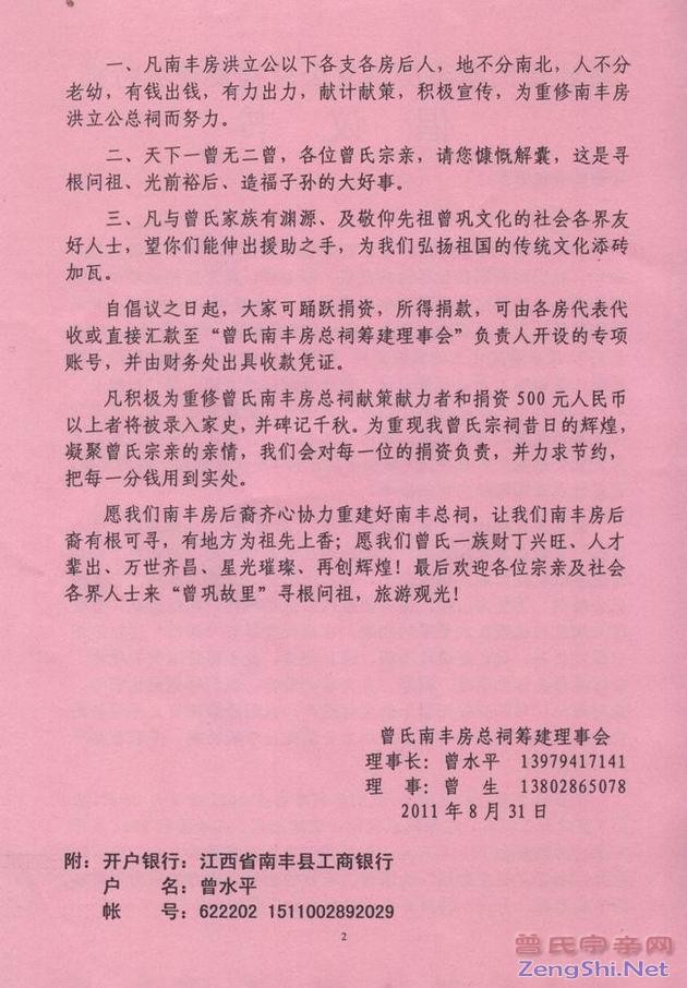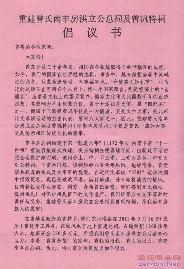 希望各地宗亲踊跃参与并献言献策,齐心协力把南丰曾氏总祠建设成为集祭奠先祖、宗亲联谊、旅游观光于一体的人文景观!