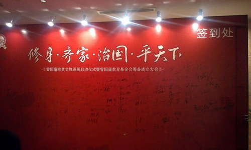 2013年8月16日,广州市圣丰索菲特大酒店举办的“曾国藩珍贵文物巡展启动仪式暨曾国藩教育基金会筹备成立大会”。 中国曾国藩酒业股份有限公司和广东电视台现代教育频道共同承办的“曾国藩珍贵文物巡展启动仪式暨曾国藩教育基金会筹备成立大会”。此为广东省民间博物馆主办的曾国藩珍贵文物巡展,本次活动以“修身、齐家、治国、平天下”为主题,以曾文正公作品展示其立言、立功、立德文化思想,本次文物展吸引了大批的学者和曾国藩迷前来参观。展品有曾国藩家书、家训和存世珍贵书法作品几十件。曾国藩是晚清公认的名臣,湘军首领,官居极品,封太子太傅、毅勇侯,谥文正。文正公一生所书著作、书信等甚多,汇编成《曾文正公全集》,文正公对中国近代政治、军事、文化、教育、经济等方面都产生了深远的影响。