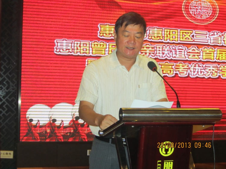 8月22日,惠州市惠阳区三省福利促进会、惠阳曾氏宗亲联谊会首届理事会就职典礼暨2013年高考优秀学子表彰大会在惠阳丽景国际花园酒店8楼隆重举行。 上午九时许,主席台大屏幕上,在祖国山川五岳,神州大地山水相连,从远古的曾子故里的滚动画面上传来男中音《曾子颂》:轻触中华长卷,跃出鲁国尊叟,一部大学,微言大义,笔法何其犀利,将故国山川上下梳理;一部孝经,句句玑理,囊括天下所有孝悌!夫仁者立德,智者立功,信者立言,三省之中,上承万载孔道神奇,下启千秋孟派之魂,看悠悠道义,知感恩孝悌;近两千多年的斗转星移,使天地浩然正气。美哉曾圣!使人心万宗归向,赞哉子舆!让华夏光辉神采奕奕,颂哉宗圣!照耀我中华屋脊!主持人介绍了与会领导和嘉宾后,就职典礼正式开始。《中华人民共和国国歌》奏唱完毕,区民政局林晓宏局长宣读了《社会团体法人登记证书》后,给法人代表曾育良会长颁发了证书。由山东省嘉祥县曾氏宗亲联合总会曾令霞副会长为首届会长曾育良先生颁发选任证书;民政局林晓宏局长为常务副会长曾克勤、曾继雄颁发了选任证书;当届会长曾育良先生为荣誉会长曾繁田先生颁发了聘任证书;荣誉会长曾繁田先生为名誉会长曾晓帆、曾庆亮先生颁发聘任证书;荣誉会长曾繁田先生为顾问郑全标、严实先生颁发聘任证书;当届会长曾育良先生、常务副会长曾克勤、曾继雄先生为曾海山、曾远辉、曾小洋、曾繁新、曾镇锋、曾惠华先生、游小丽、魏妮女士等50位副会长颁发委任证书;常务副会长曾克勤先生为监事长曾远辉先生、监事曾竟峰、曾献安、曾志锋、曾继生、曾镇辉先生等颁发委任证书;常务副会长曾继雄先生为秘书长曾文胜先生、副秘书长曾祥造先生、魏妮、何桂玲女士等颁发委任证书;副会长曾柏棠、曾小洋、曾文胜、曾志锋、曾育军先生等为曾伟星、曾勇巧、曾小凌、曾伟忠先生等51位理事颁发委任证书。首届就职典礼结束后,接着对2013年高考优秀宗亲学子进行表彰奖励。会上,在曾文胜秘书长宣布受奖学子名单后,为今年受奖的63名宗亲学子每人颁发“宗族之光”牌匾一块,对考上硕士研究生的曾广深学子颁发奖学金5000元,对考上重点本科的曾昱为等13名宗亲学子每人颁发奖学金3000元,对考上二本A线的曾顺达等28名宗亲学子每人颁发奖学金2000元,对考上二本B线的曾令巧等21名宗亲学子每人颁发奖学金1000元。同时,为平潭镇光明村特困户曾晓梅同学,颁发了5000元助学金。