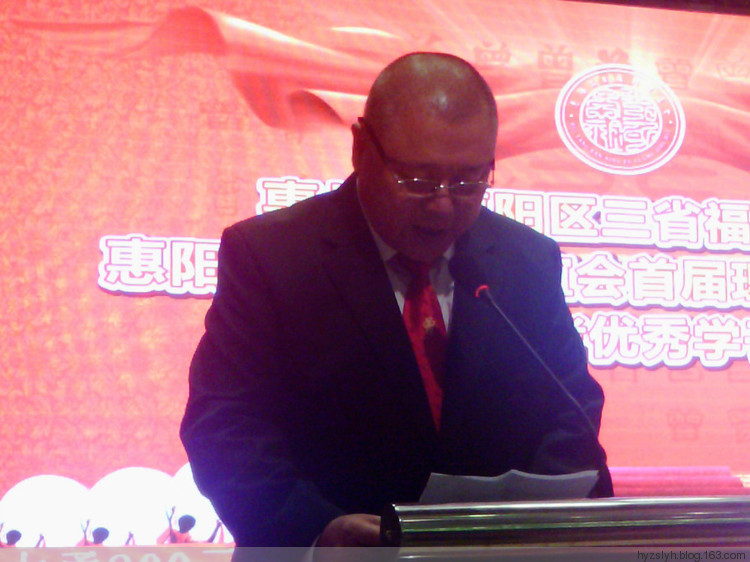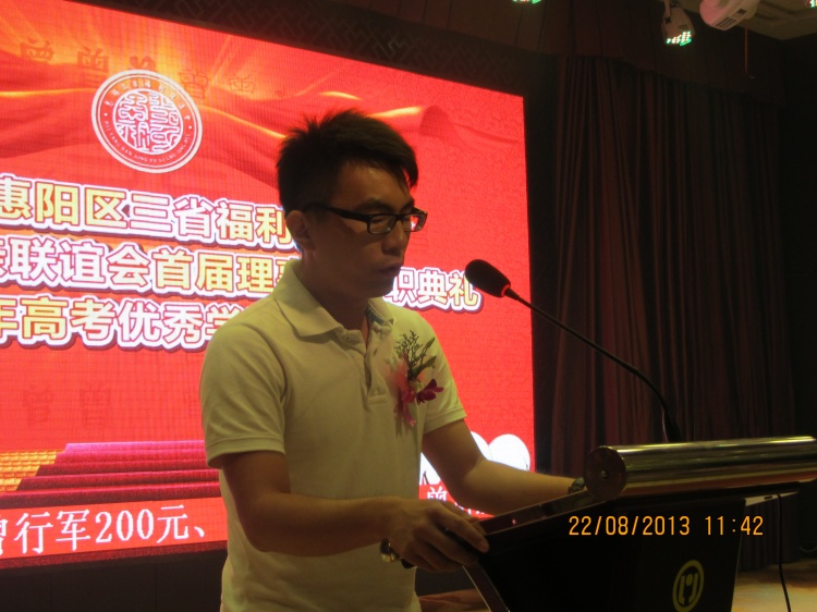 领奖完毕,受奖学子曾广深同学代表全体同学上台发言,他说,今天,我很高兴,也很激动,感谢宗亲会给我这个机会站在台上,代表授奖的全体同学发言。……我们向区领导和长辈表示,今后,我们在生活上,要以雷锋为榜样;在学习上,要以匡衡为榜样;在工作上,要以白求恩为榜样。有句话说得好:“播撒一种思想收获一种行为,播撒一种行为收获一种习惯,播撒一种习惯收获一种性格,播撒一种性格收获一种命运”。撒播一种榜样,我们能够时时看到奋斗的目标和方向。榜样是一种向上的力量,是一面镜子,是一面旗帜。………  紧接着,受奖学子家长曾繁新先生代表全体家长上台发言。他说,……作为家长,我对同学们提出三个要求:第一个要求是牢牢把握上大学的难得机遇。上大学是人生中一个新的起点,要努力拼搏,充分利用在校时间学好本领、锻炼才能,使自己成长为栋梁之材。争取一切可以继续深造的机会,向硕士、博士进取。第二个要求是要学会感恩。你们要常怀感恩之心,始终把父母长辈、老师的殷切希望、同学朋友的关怀帮助铭记予心。奋发向上,刻苦求学,要以优异的成绩报答父母长辈、亲朋好友的关怀与鼓励,回报社会。第三个要求是更深入了解自己的家族,不忘家乡,不忘宗亲,更重要是要弘扬祖德与宗族精神,团结宗亲,共续文化,传承宗族的优良传统。  荣誉会长曾繁田先生代表三省福利促进会勉励在座授奖学生。他说,各位弟子,你们要紧跟大好形势,努力学习,自强不息,不断丰富和提升自己,为将来更好地适应社会进步,适应科学发展,不断攀登科学高峰,为国为民而努力奋斗!  区委宣传部副部长、区社科联主席刘海涛女士高度概括并肯定了惠阳三省福利促进会所做的工作,激励大家在曾育良会长的带领下,把今后工作做得更好。同时,勉励授奖学子努力学习,完成学业,建设家乡,报效祖国。 最后,在常务副长曾克勤先生致谢词后,宗亲名歌手曾瑞体女士现场演唱了《曾子之歌》,会议在欢乐祥和的气氛中落下帷幕。