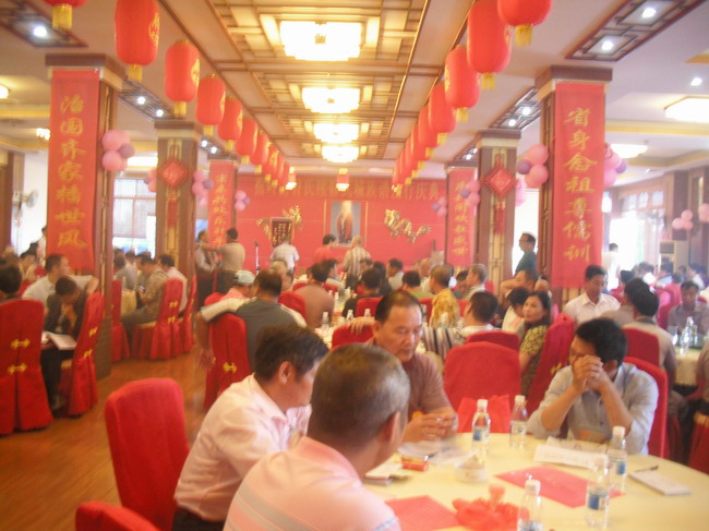 10月9日上午,来自海外、全国各地、本省各县、蕉岭当地300多曾氏宗亲相聚在蕉岭县城“万事好酒家”,举行蕉岭县续修《武城曾氏族谱》发行仪式。这天“万事好酒家”正门张灯结釆,锣鼓喧天,金狮起舞,迎接前来参会的曾氏宗亲,会务组工作人员热情地接待前来参会宗亲,向宗亲们发送会议文件及签到手续。