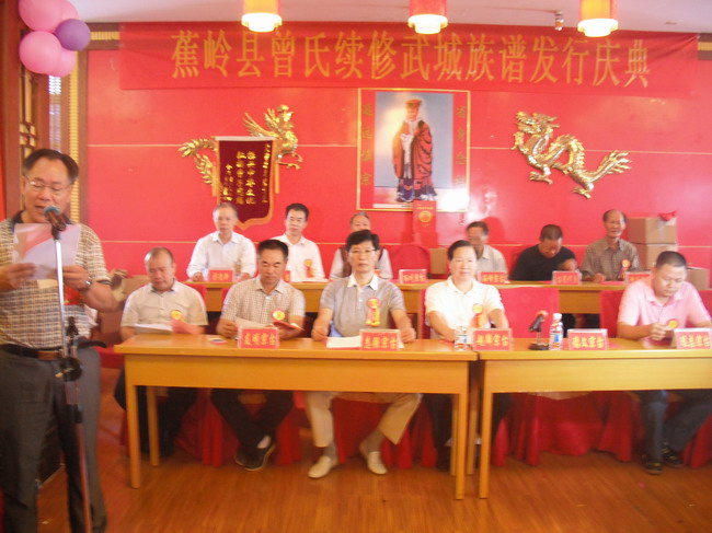首先由蕉岭曾氏宗亲会会长德文宗长致开幕词。他代表蕉岭曾氏宗亲对所有参加族谱发行庆典活动的海内外宗亲、宗长、嘉宾们表示热烈欢迎。致谢来自新加坡、台湾、四川、湖南、江西、广西、广东梅州各县、区居住的曾氏宗亲,在修谱期间给予的帮助和支持。