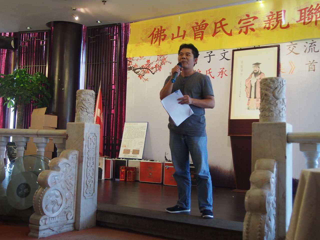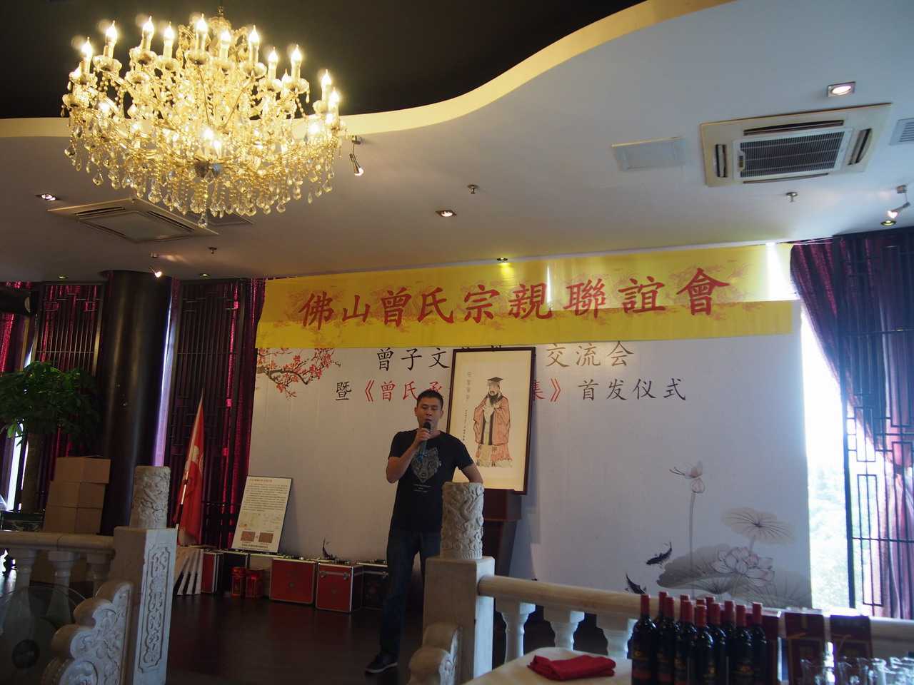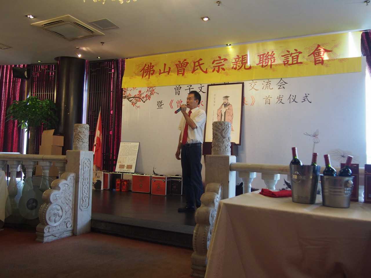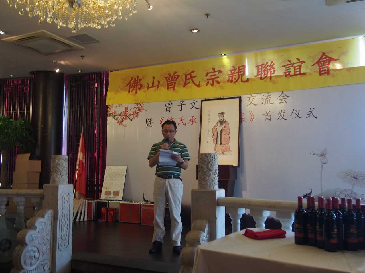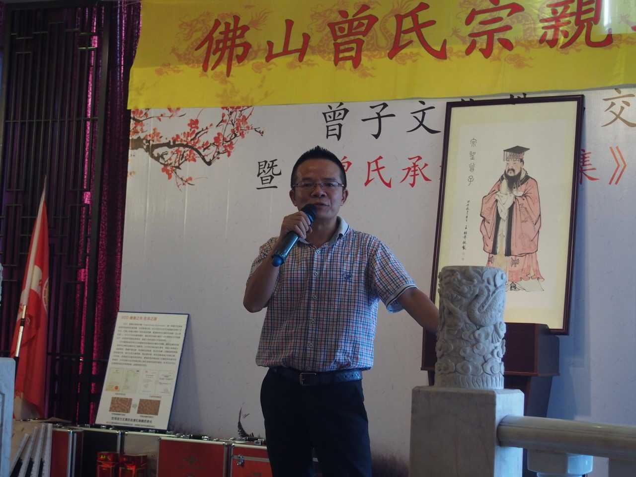 曾百友在致辞中,对昭演先生热爱传统文化,潜心研究儒家学说、曾子思想道统二十多年,把他多年来撰写和发表过的文章,经过精选编著成《曾氏承祖轩文集》,以飨宗亲和广大读者的善举给予高度评价。并对《曾氏承祖轩文集》的成功首发表示热烈的祝贺。同时,对佛山宗亲联谊会在昭演先生的倡议下,团结宗亲、研究曾子思想, 弘扬传统文化方面所取得的成绩给予高度赞扬。他希望在此基础上继续努力,争取早日成立“佛山市曾子文化研究会”,为佛山广大宗亲提供合法活动的平台,为更好地传承曾子思想,弘扬中华优秀传统文化作出更大的贡献!