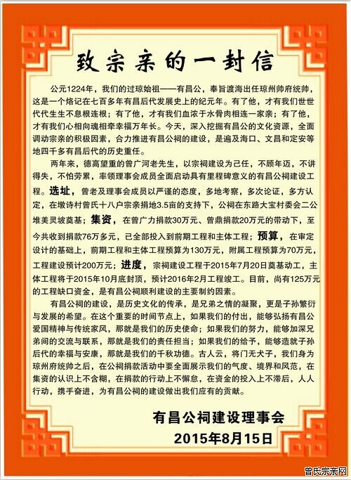 新建的有昌曾公祠,位于文昌东路大宝村委会二公堆美灵坡,乃本房南宋入琼始祖有昌公专祠,其后裔子孙众多。8月20日下午,曾氏宗亲联合总会副会长广河宗亲带领理事会成员到宗祠建设工地,他们心系家族宗祠建设进度,不怕炎热、不辞劳苦,多次亲自到现场察看有昌曾公公祠的建设情况,并就建设过程中遇到的问题谈一些建议。 据文昌市曾氏宗亲会长广力宗亲介绍,有昌曾公祠自2015年7月20日奠基动工以来,近二万后裔族人,为建祠齐心协力、积极捐资。祠堂工程建设进展顺利,現己初具规模。建宗祠用地为撴诗村宗亲捐赠,占地面积3.5亩,在建宗祠位置优越,风水极佳。阖族团结一心,祈求宗祠早日开光,先祖永享祭祀,福荫后裔。 修宗祠堂,共振家威,凝集宗族,名扬祖恩。我们要牢记祖训,弘扬祖德,道传一贯,精诚团结,三省诚身,忠恕至善。望广大宗族,慷慨捐款,为宗祠出份微薄力量,早日建成,共圆祖先梦。