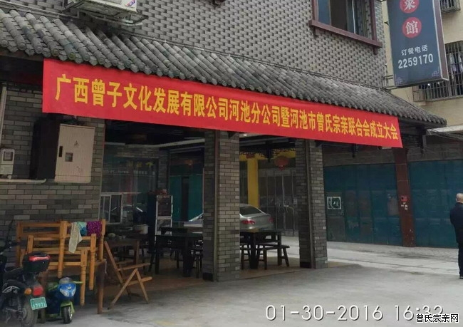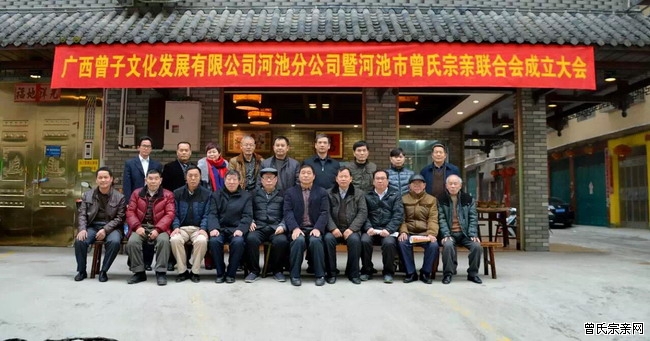 2016年1月30日,广西曾子文化发展有限公司河池分公司暨河池市曾氏宗亲联合会成立大会在金城江区品福楼举行,广西宗亲会常务副会长曾元光,秘书长曾平坤亲临现场指导,并代表广西曾氏宗亲会向河池宗亲会赠送贺礼一千元。