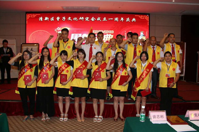 清远市清新区曾子文化研究会一周年誌庆活动及清远市曾子文化研究会义工队成立授牌仪式在清新花园酒店隆重举行 于6月25日,来自各镇村的曾氏宗亲和省、市及市县-、区的宗亲会的领导与嘉宾500多人汇集清新花园酒店大会议厅,隆重举行区会成立周年誌庆话动。在活动仪式上,省、市、区会领导分别致辞,区会理事作了一年来工作总结,区会总顾问作了修谱工作的总结讲话,省、市会领导分别向区会会长、理事长、副会长、理事、各镇分会会长、区会顾问颁发了荣誉牌匾、荣誉证书。市会正式组建了清远市曾子文化研究会义队,并为义工队授旗,义工队员举行了庄严的宣誓。活动进一步传递了“孝悌忠信,礼仪廉耻,三身修身,道传一贯”的曾子训言,表达了宗亲们团结向上,传递爱心,和谐生活的共同情感,成为凝聚宗亲力量,发挥正能量的平台。清新区五百多名宗亲代表参加了本次活动。 热烈祝贺周年誌庆及义工队成立授牌仪式活动圆满成功!