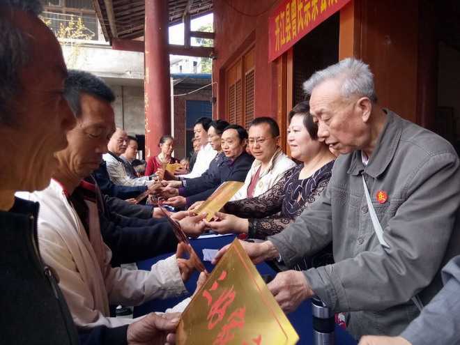 2、由达州市会秘书长曾进家人和开江县第三届会长令光家人向高龄老人曾宪木、蒋明玉颁发补贴