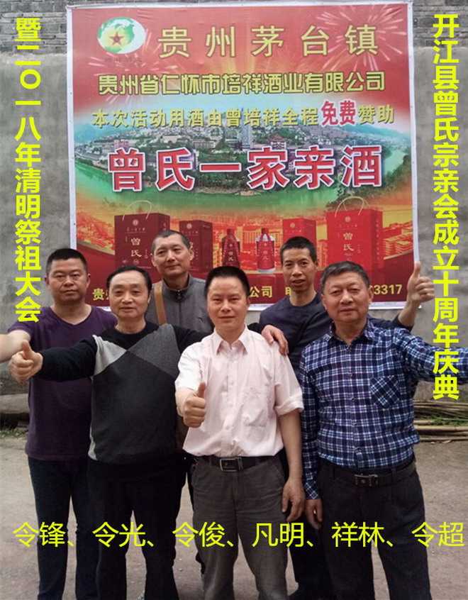 开江县曾氏宗亲组织全体成员以及开江县曾氏族众衷心感谢贵州省仁怀市茅台镇培祥酒业有限公司董事长曾培祥为清明祭祖大会餐用酒的免费赞助!感谢开江县宝石镇中心村凡明家人为清明祭祖大会活动免费提供的专业音响以及充气拱门和充气大象设备!更要感谢四川省曾子文化研究会副秘书长兼法律顾问晓浪家人、达州市曾氏宗亲会副会长兼秘书长曾进家人、达州市曾氏宗亲会副会长祥维家人、达州市中医学院党委副书记兼工会主席令祥家人,以及开江县普安镇新场村老年文艺宣传队与新场村姐妹舞蹈队和参会族亲们的光临和大力支持!