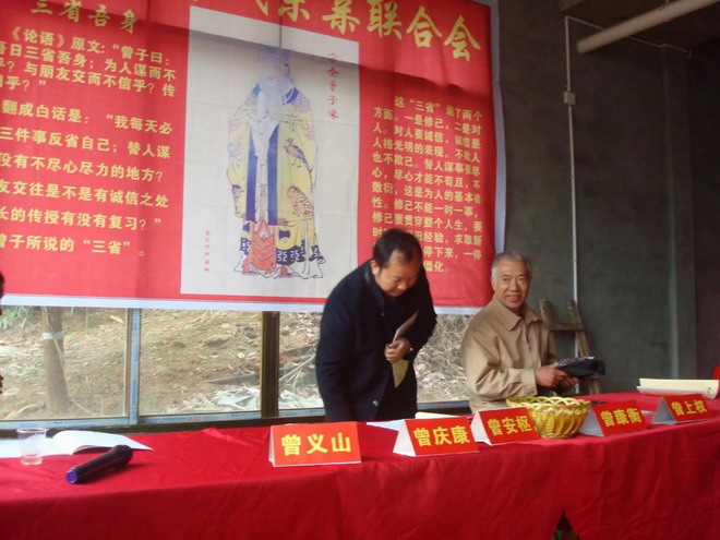 六,宜宾曾子文化研究会长曾上权即兴讲话,他对大会圆满召开表示祝贺,对新当选的曾康衡,庆康,义超新班子成员表示祝贺,对御任的曾义楹宗亲十年来的艰苦执着努力,不畏难惧,忘我为曾氏作出的贡献表示充分肯定,号召大家向他致敬学习,共同为曾氏的发扬光大作努力。他要求一,抓好修谱,二搞好宗亲联谊活动,三做好敬老慰问,四,办好学子成材鼓励,五调好宗亲内务,六学好曾子宗圣博大精深传统文化,为弘扬宗圣思想努力添光加彩!同时,介绍了曾氏宗宗亲网站办网特色及各省市宗亲组织平台,盼年轻人多参与,发挥作为。并向新当选的会长,副会长颁发了任职证书。