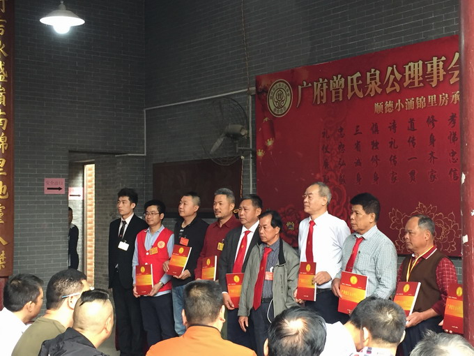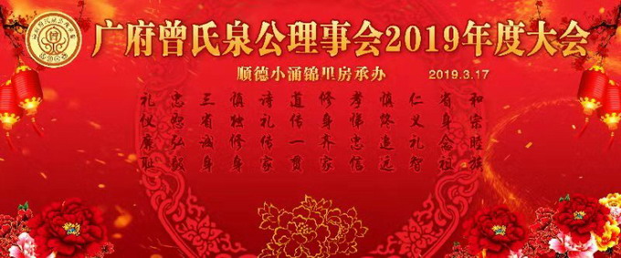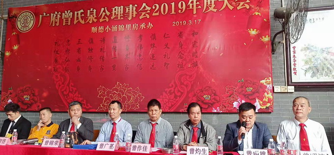 2019年3月17日,广府曾氏泉公理事会在广东佛山市顺德区乐从镇小涌村前峰曾公祠举行了一年一度的理事大会。理事会由于有着房系共祖的特殊性,宗圣四十八派泉公为该房定居广府之祖,泉公生四子,后称四大房,其后裔遍布珠三角、以及广西、海南等地,分衍村庄百多个,后裔人数众多,因此每年年会理事代表均来自各衍居地,理事二百多人,均为各房推选每村庄二、三人为理事代表组成,加上嘉宾、承办地方邀请族人和义务工作者,是日参加活动总人数多达六百多人。 大会按照程序安排准时在早上十点开始,首先由主持人昭演宣读广东省会、曾氏宗亲网等宗亲组织的祝贺!随后宣读大会纪律,以及注意事项等。