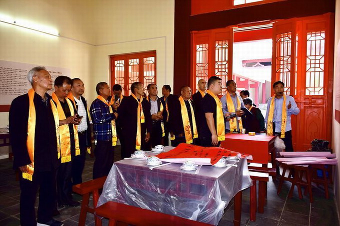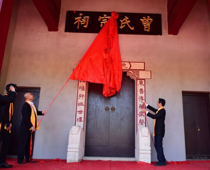 曾氏宗亲联合总会监事长曾广春、中原曾子文化研究会新县分会会长曾宪森为曾氏宗祠揭彩。