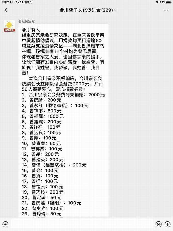 倡 议 书 各位宗亲: 你们好!当下,湖北疫情牵动世人心,真情连着你我他,病魔无情人有爱,面对全国各地乃至世界各国都在积极的捐款捐物,参与到湖北抗疫中,为早日打赢这场关于全人类的事,曾氏儿女岂可闲之!更何况这次捐助的对象是生活在湖北疫区的曾氏宗亲,是与我们同脉同根的家人,为坚定他们战胜瘟疫的信心和真切地感受到血脉之爱,给予我们力所能及的爱心。经重庆宗亲会研究决定,在重庆曾氏宗亲中发起捐助倡议,用捐款购买和运输60吨蔬菜支援疫情灾区——湖北省洪湖市乌林镇,该镇共有11个村均为曾氏后裔,体现老曾家之大爱,也因你宗亲的援手,让他们能有发自内心的感受:我姓曾,有族爱!我姓曾,我骄傲,我姓曾,我自豪! 各位宗亲,请献出你的一份爱,用实际行动表达对疫情灾区同胞的关切,为社会献爱心,为祖国做贡献。宗亲们,让我们为家族同胞,为国家,尽一份心,出一份力,献一份爱心!为武汉加油,为中国加油,为战斗在疫情一线的所有逆行者加油! 注: 1,所有捐助款请直接通过微信打理; 2,曾理微信号15523299514 3,捐款截止时间为2月22日中午12时。 重庆曾氏宗亲会秘书处 2020年2月21日