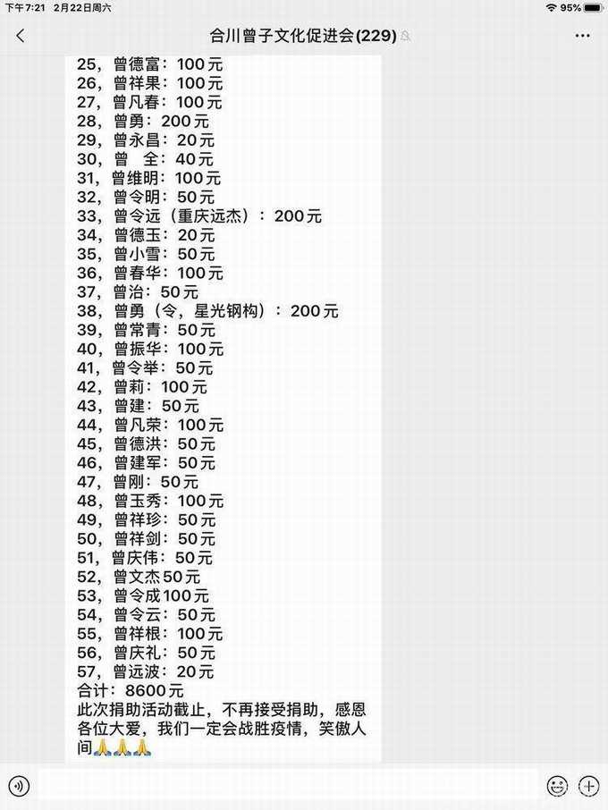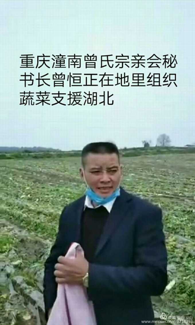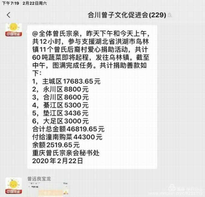 感谢信 亲爱的主城区、潼南区、永川区、合川区、綦江区、垫江区、大足区、梁平区的宗亲,你们好! 生活在疫区的湖北洪湖市乌林镇的曾氏宗亲需要60吨蔬菜度过难关,以便能用更多的精力投入到抗疫斗争中去。由潼南宗亲会捐助30吨蔬菜,其它各区县宗亲会合捐30吨蔬菜。时间紧迫,需一天内筹集到足额的善款,购买足量的蔬菜,并及时按时的送到受捐的曾氏宗亲所在地。 由于时间紧迫,重庆曾氏宗亲会决定发动重庆宗亲的力量,受到你们的大力支持,积极的发布信息并积极的募捐,最后终于在一天之内圆满完成了善款募捐,及时的把购买蔬菜的善款及时的送到潼南宗亲会,并及时的购买了蔬菜运往受捐地区。 在此,重庆宗亲会谢谢你们的紧密配合积极参与!谢谢你们的善举和无私的大爱!为重庆曾氏宗亲,乃至于为重庆人争了光! 这次应受到表扬的是:潼南区曾氏宗亲会、永川曾氏宗亲会、合川曾氏宗亲会、綦江曾氏宗亲会、垫江曾氏宗亲会、大足曾氏宗亲会、梁平曾氏宗亲会筹备会。 最后祝为这次募捐积极参与的宗亲及家人,身体健康,阖家幸福安康,鼠年吉祥如意!生意兴隆,一切顺利! 重庆曾氏宗亲会秘书处 2020年2月22日
