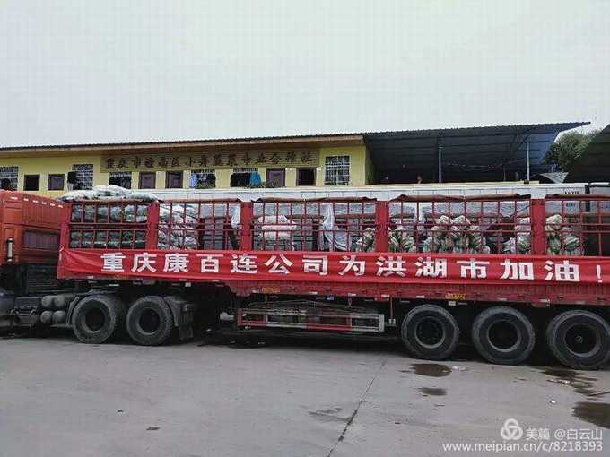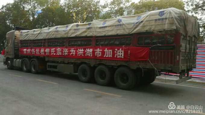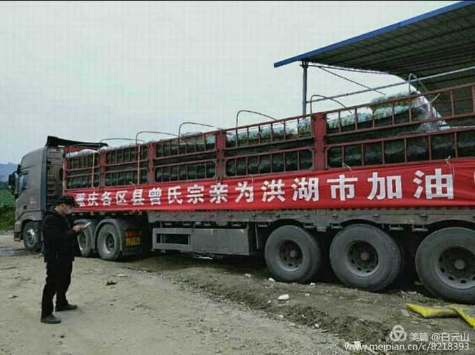 经过十几个小时八百多公里的长途运输,两辆装载着满含重庆市广大曾氏宗亲深情厚谊的六十三吨蔬菜大货车终于抵达江汉明珠洪湖市。