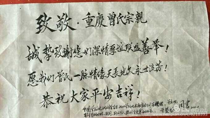 尊敬的云安会长、志新秘书长;尊敬的重庆市曾子文化研究会及各区、县曾子文化研究会、广大的曾氏宗亲们:您们好! 您们饱含着重庆市全体曾氏宗亲的深情厚义,时刻关注关心我们湖北新冠肺炎疫情重灾区中所受煎熬的广大曾氏宗亲!正是这种血浓于水的血缘亲情,在我们最困难的时候,你们向我们湖北省洪湖市民政局慈善总会送来了,你们甘冒病毒感染的巨大风险,在严寒中一路逆行送来的六十三吨新鲜蔬菜。你们的大爱之举,深深感动了洪湖市市局领导及全体洪湖市人民群众!同时,也使我们湖北五十万曾氏宗亲感到莫大的荣幸和自豪! 六十三吨新鲜蔬菜,包括运费价值十二万多元人民币,他是全体重庆曾氏家人对湖北宗亲的牵挂和渝鄂宗亲手足深情地展现,是青山一道同云雨,明月何曾是两乡的手足情怀。 六十三吨蔬菜,情重如山!六十三吨蔬菜,恩情似海!湖北宗亲将永铭刻心!我们坚信,此次疫患,有党和政府的英明正确领导,有英雄的人民解放军和医护人员的全力奋战,有您们对湖北曾氏宗亲的大力支持,我们一定会战胜疫魔,取得最终的胜利! 在目前特珠情况下,我们甚至不能外出接待你们,不能为你们安排一顿可口的饭菜,只能由政府接待安排。应当说这是有失礼节的,对此,我们深感愧疚!在此,我们湖北宗亲心怀诚挚之心,向你们——重庆曾氏家人们深深地鞠躬!感谢你们啦,我至亲至爱的家人们! 情深脉脉化无语, 爱意怀抱甚分明。 宗谊皑皑永铭记, 渝鄂手足情似海。 待到山花烂漫时, 把酒问盏溢湖光。 中国曾子文化委员会湖北分会。 湖北曾子文化发展有限公司 洪湖市曾氏宗亲联谊会 2020年2月23日