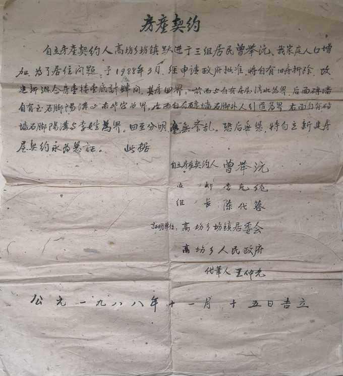 从广东徙川开基祖元和公房维仁公系六代孙曾绍堂公,字子亭(七代曾登义,字高亭,八代曾鹏书,字佑林),一生勤劳,省吃俭用,与其子登义公,孙鹏书伯经过多年艰苦打拼,一把大火,将旧房被烧尽后,经当地时政府及知名人士集体商量议见证立契约决定,由子亭公佑林伯自备铜钱二千文在高场场横街口榨子口与姚姓相邻处修建一百一十七多平米木板串夹瓦房,双开间铺面,内设多个房间,生活设施功能齐全,建成后,在高场人眼里气势十足,诱人眼帘,很有点势头。