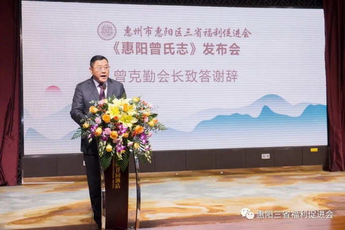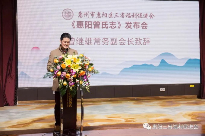 惠阳区三省福利促进会曾继雄常务副会长在致辞中讲述了成书历程:在一年多的时间里,编写人员实地走访了155处曾氏村落,询问长者、查看族谱、拍摄照片,确保史料充分。书稿出来后,我们请广东省曾子文化研究会、惠州市曾子文化促进会的专家和顾问进行了审阅,在专家和顾问提出意见的基础上,经过七易书稿,完成了《惠阳曾氏志》。这本姓氏志书,让一代接一代的曾氏文化得到了延续。他对为《惠阳曾氏志》提供过资料、进行过帮助、给予过关心的领导、专家、宗亲,表示深深的谢意!
