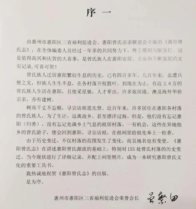 《惠阳曾氏志》是惠阳第一部姓氏志书,被惠阳区图书馆、惠阳区博物馆、惠阳区档案馆永久收藏,令其惠被当代,泽流后世。