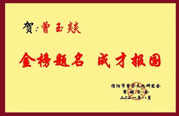8月4日,信阳市曾子文化研究会商城分会全体班子成员就一年一度的助学奖学活动在本县吴河乡六甲畈村曾昭峰家举行。信阳市会会长曾宪付为曾玉燚颁发了牌匾。商城分会会长曾凡林代表研究会为这名北京大学学子送去了5000元奖学金。