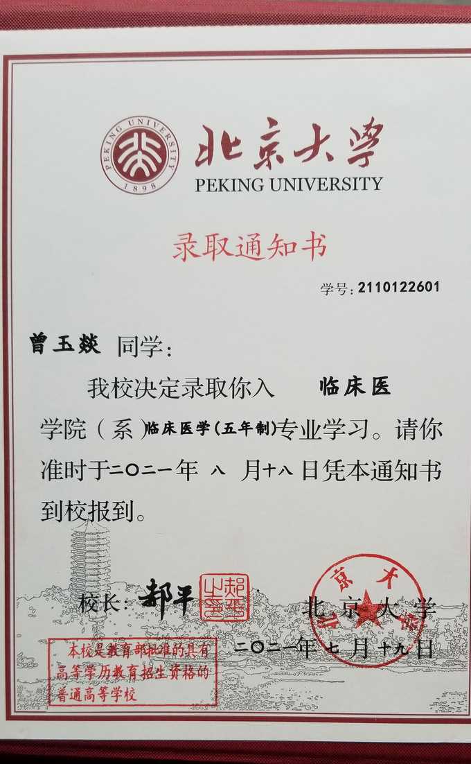 您的位置:首页 -> 宗亲投稿 -> 河南信阳市商城县曾玉燚被北京大学录取