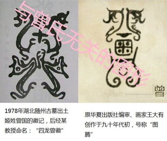 上图左,是1978年在随州曾国古墓(曾侯乙墓)出土的徽(或称“四龙曾徽”),曾氏宗亲网有多篇论文论证过(详阅宗亲网主页),为周代分封姬姓曾国的徽记,是一个历史悠久的侯国,但与曾氏毫无关系,国与姓氏不可混为一谈。
