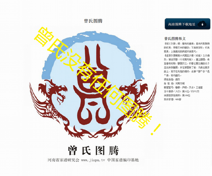 更有甚者、河南省姓氏文化研究会家谱委员会2014年发布《中华姓氏图腾》,看看曾氏是怎样搞吧:“曾氏图腾”!!!为了商业利益,严重歪曲历史,不想评论了,大家思考一下吧。