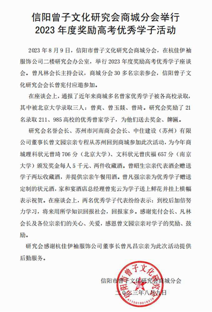 -> 信阳曾子文化研究会商城分会2023年奖学活动