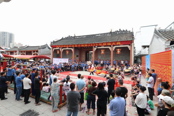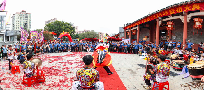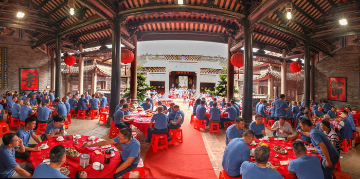 墓祭十点结束,十点半开始在新桥曾氏大宗祠举行合族祭祀典礼。这是该族历史悠久的传统,也是广府传统祭礼仪式,已经纳入深圳市宝安区第六批非遗项目“曾氏家风”。大宗祠祭祀典礼以传统模式,经简化的祭祀程序进行,主祭、陪祭、司礼、长老等主要成员穿着旧式礼服,其余全体成员穿理事会设计的蓝色统一服装参与祭祀,祭礼场面庄严而壮观,守礼而和谐。两个祭祀典礼之余,安排了麒麟、醒狮等表演,参观各功能祠堂等交流活动。午间设宴联欢,筵开168席。活动在祥和、友爱的气氛中圆满结束!令所有参与者感受到曾氏家族的传统文化,尤其年轻人体验到汉族传统祭礼的承传。
