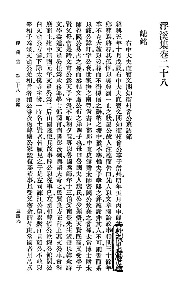 原名:右中大夫直寳文閣知衢州曾公墓誌銘 宋 汪藻 撰《浮溪集 巻二十八》