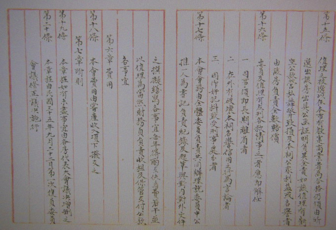 第十七条:本会会务由全体委员负责共同办理,就委员中公推一人为书记,负责记录、起草与对内对外文件之撰拟,缮写各事宜,每年得酌支伕马若干。并以值理为当然财务员,负责收租及保管交付公款各事宜。