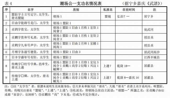 场长子盟鉝字士立号定宇,为元配李氏所生,是安公曾孙辈中出生最早的,太学生,册名盟镜。商武岡旋于安乐乡江口家焉,葬武岡江口屋后。配刘氏,籍宁乡西塘,葬西塘屋后;继娶吳氏,籍麻城,葬武岡江口屋后;副室张氏,籍湖北江夏,葬武岡陡溪铺,生子 9。朝场公裔的优学迹象,主要体现在盟鉝公这一支,盟鉝公一支清嘉庆时丁数大约 200,功名情况见表 4。