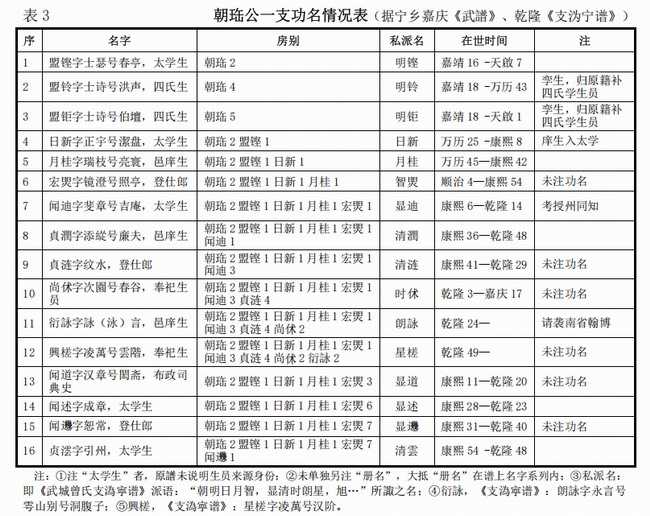 朝晨公,于成化元年生,弘治 5 年携杨氏徙居安化县后乡,初居之所人称“江西冲”。公生鸣凤、鸣凰。据宁乡忠谋堂所修《武譜》,朝晨公一支清末丁数大约 600,功名情况见表5。