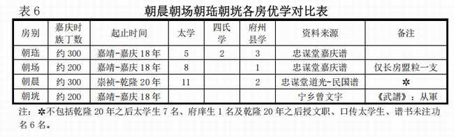 上述族支嘉庆时族丁数约 200—300,明嘉靖至清中期 200 余年累计有秀才层次功名者 8—13 人,并且都没有上举人层次,又都以太学生为主,其比率远超一般黎庶族支比率,与谱系明白的曾氏子孙享有优学时间吻合。