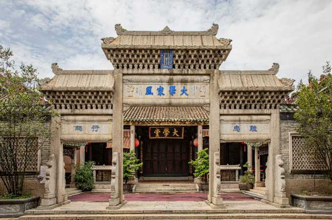 进祠穿越门楼即前庭院天井,一座四柱三门高大石雕牌坊映入眼帘,牌楼材料由雕琢细腻的花岗岩砌筑而成,四柱三间三楼仿木结构,每楼有三层花拱一层托斗,庑殿顶牌正脊中央有石刻寿桃云,两侧各饰鸱吻,垂正脊各雕饰一条龙图案。石仿木结构七踩如意斗拱,每柱前后有抱鼓石相护,抱鼓石是用一块完整青石雕琢而成。牌楼正匾横额上书写着“大学家风”四个苍劲有力的大字。因宗圣曾子撰《大学》一书,以此纪念圣祖曾子,又勉励后人承传良好家风,谨记先祖的教诲。右侧落款“大清嘉庆三年戊午冬初冬之吉立”,左侧署“堂下孙腾光拜题,应中敬书”等小楷。横匾两头有一手托鼎、一手抱芴的文臣浮雕像,横匾上篆顶石刻“贻典”两个字,左、右两间门额各书“体忠”,“行恕”。